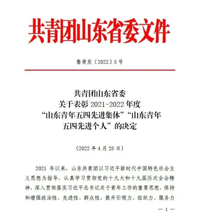 近日,共青团山东省委公布《关于表彰2021-2022年度“山东青年五四先进集体”“山东青年五四先进个人”的决定》,天润工业技术股份有限公司团委荣获“山东省五四红旗团委”荣誉称号。