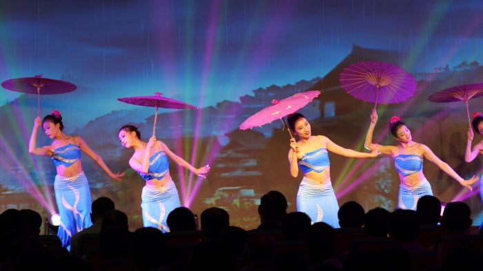 演出在舞蹈《岱海涟天》中拉开帷幕,一次次转动,卷起一朵朵浪花;一个个背影,拼凑出泰山的伟岸……优美的舞姿,演绎出浪花的柔美与泰山的雄伟,展现劳动者的博大胸怀和淳朴品格。